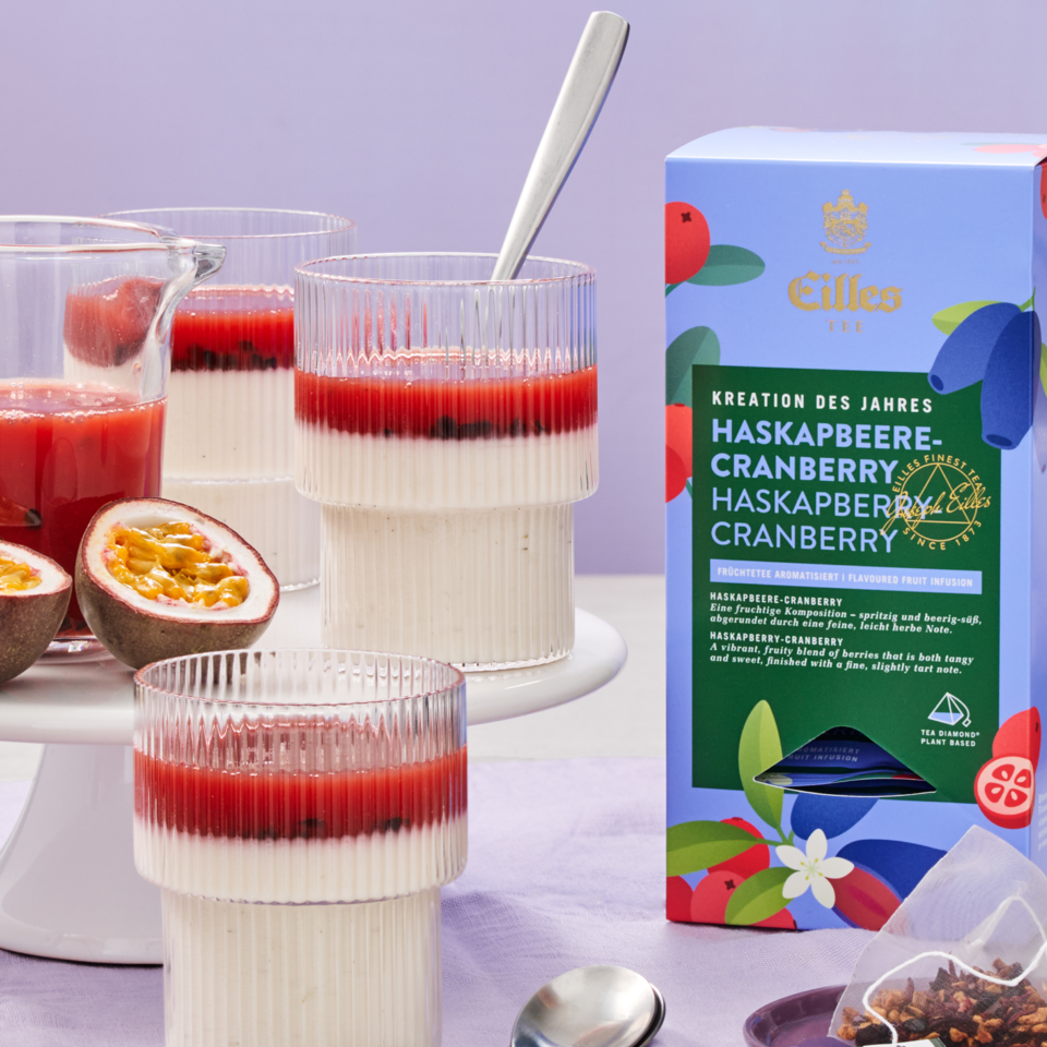 Den Tea Diamond® EILLES TEE Haskapbeere-Cranberry mit 150 ml kochend heißem Wasser übergießen. 10 Minuten ziehen lassen. Die Passionsfrüchte halbieren und das Fruchtfleisch herauslösen.